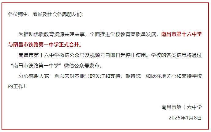 南昌十六中發布公告,南昌市第十六中學與南昌市鐵路第一中學正式合并,南昌市第十六中學微信公眾號及視頻號停止使用公告,公告全文如下: