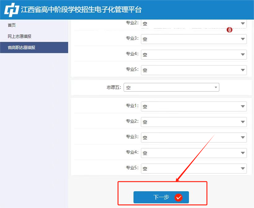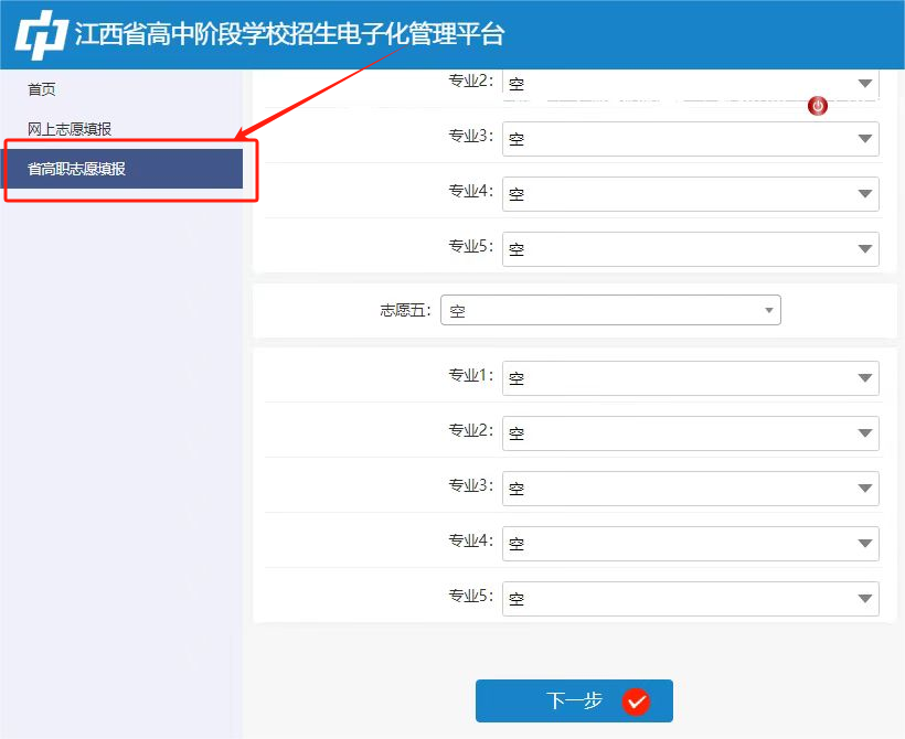 第三步:選擇“志愿一”,在下拉列表中根據考生專業分別選擇:(注意:請認準上猶中等專業學校→江西環境工程職業學院)